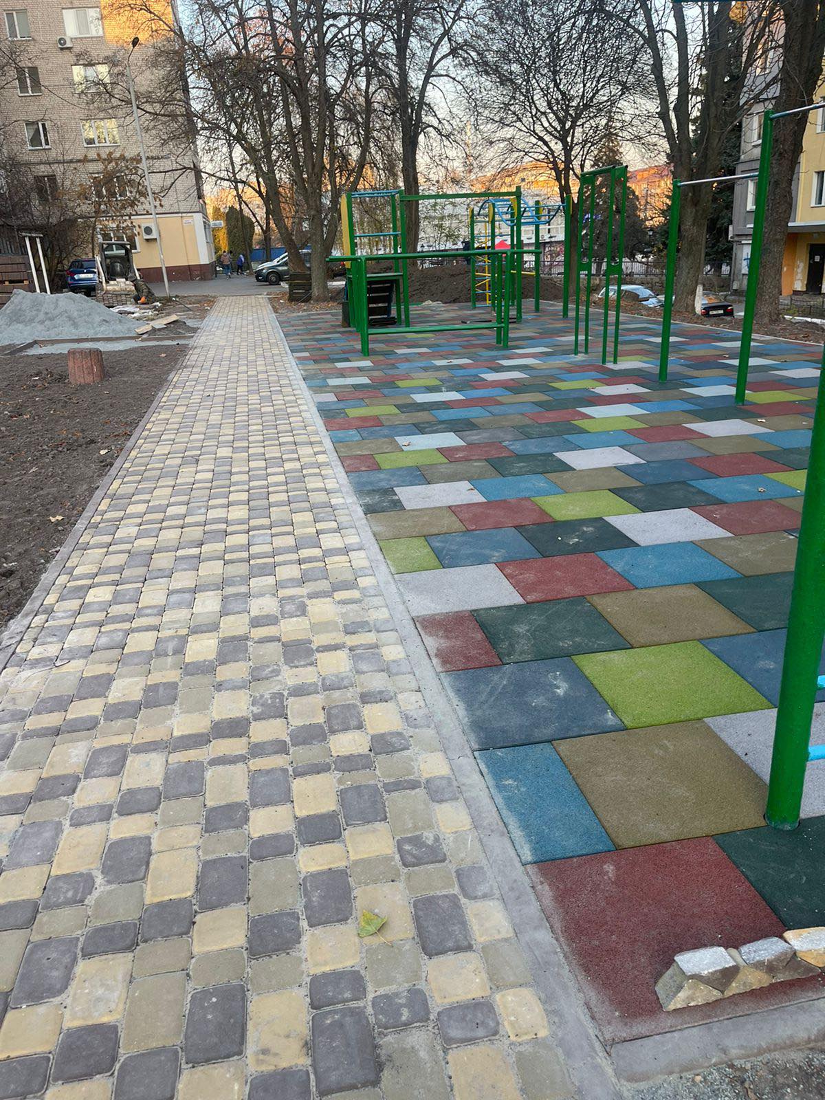 Наразі працівники «АМК РЕМ-БУД» вже виконали основну частину запланованих робіт. Для комфорту жителів міста вони влаштували пішохідну доріжку із тротуарної плитки, а для безпечного та змістовного дозвілля місцевої малечі – нове гумове покриття на дитячому майданчику.