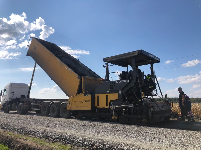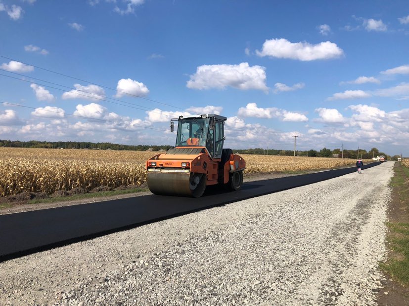 Наразі працівники компанії працюють над укладкою вирівнюю чого шару із дрібнозернистого асфальтобетонного покриття (тип Б), а після завершення робіт розпочнуть влаштовувати на дорозі фінішний верхній шар.