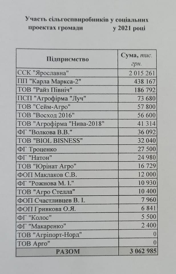 Щодо участі у соціально-економічних угодах, то СКК «Ярославна» став і тут першим, сплативши більше, ніж усі решта аграріїв разом узяті. Так за 2021 рік підприємство інвестувало у розвиток територій більше 2 млн гривень, при цьому інші підприємства спрямували значно менше коштів – від 438 тисяч гривень до 2,4 тисячі гривень, а дехто (серед яких є і компанія-мільярдер) взагалі проігнорував це, не давши жодної копійки.