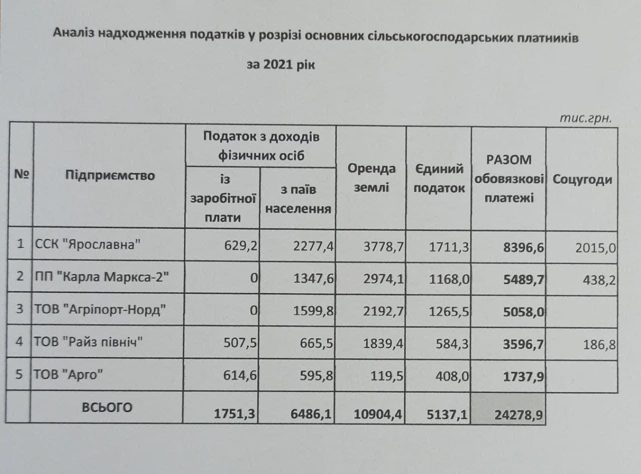 Так, минулого року, за даними Путивльської міськради, загальна сума обов’язкових платежів від п’яти найбільших сільгоспвиробників громади склала 24,3 млн. грн. Усі вони згідно закону сплачували єдиний податок, орендну плату за користування землею, податок з доходів фізичних осіб (як з паїв населення, так і зі своїх працівників). Найбільше було сплачено ССК «Ярославна» – понад 8 млн гривень. У розрізі надходжень виглядає наступним чином: за заробітну платну – 629 тис гривень, за паї населення – понад 2,2 млн гривень, за оренду землі – понад 3,7 млн гривень, за єдиний податок – 1,7 млн гривень. Додамо, що решта підприємств, які працюють на території громади, заплатили врази менше податків – від 5,4 млн гривень до 1,7 млн гривень.
