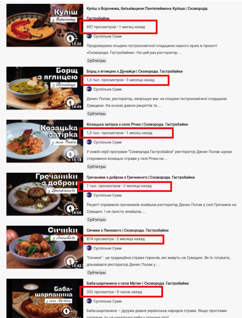 За 12 випусків, в яких показують, як ресторатор подорожує віддаленими селами, «досліджує їх життя та побут, знаходить цікаву гастрономічну спадщину», сумський телеканал заплатив аж 610 тисяч гривень! Більше 50 тисяч гривень за кожен випуск, хронометражем 15-22 хвилини. На папері все це звучить цікаво, а по факту в Youtube – до тисячі переглядів у середньому. І то не виключено, що це не без допомоги…