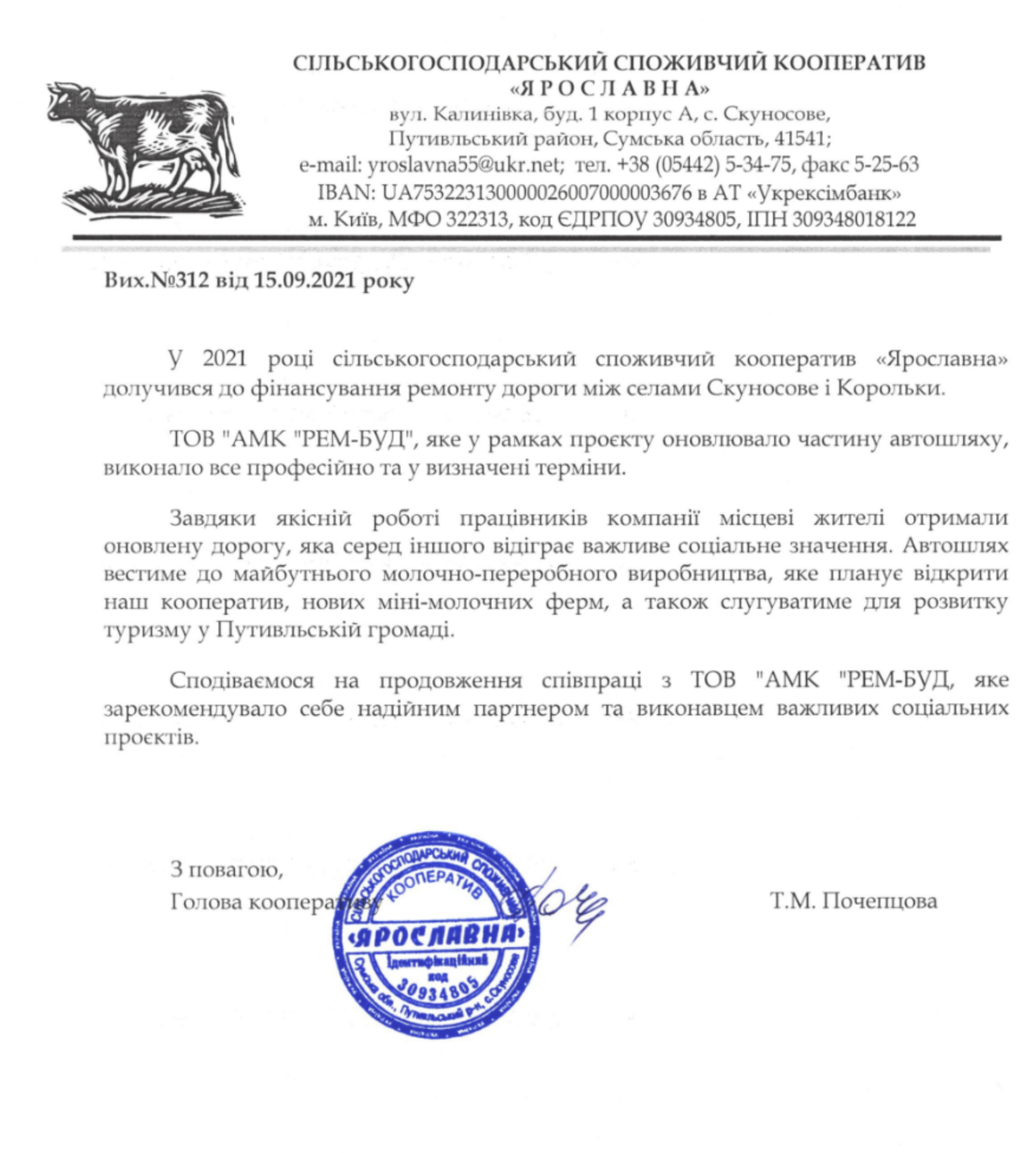 «ТОВ «АМК РЕМ-БУД», яке у рамках проєкту оновлювало частину автошляху, виконало все професійно та у визначені терміни. Завдяки якісній роботі працівників компанії місцеві жителі отримали оновлену дорогу, яка серед іншого відіграє важливе соціальне значення. Автошлях вестиме до майбутнього молочно-переробного виробництва, яке планує відкрити наш кооператив, нових міні-молочних ферм, а також слугуватиме для розвитку туризму у Путивльській громаді», – йдеться у відгуці за підписом голови кооперативу Тетяни Почепцовой.